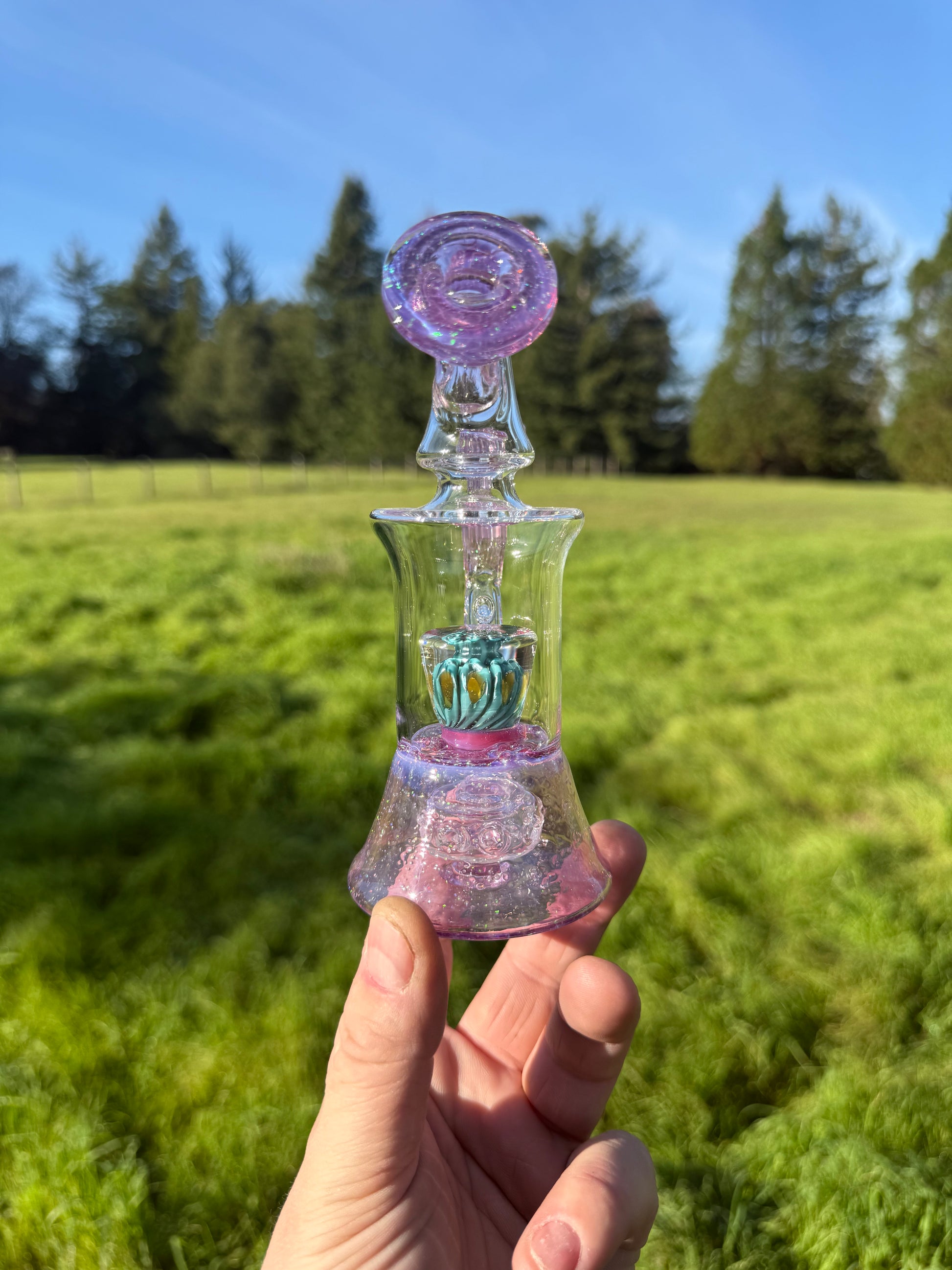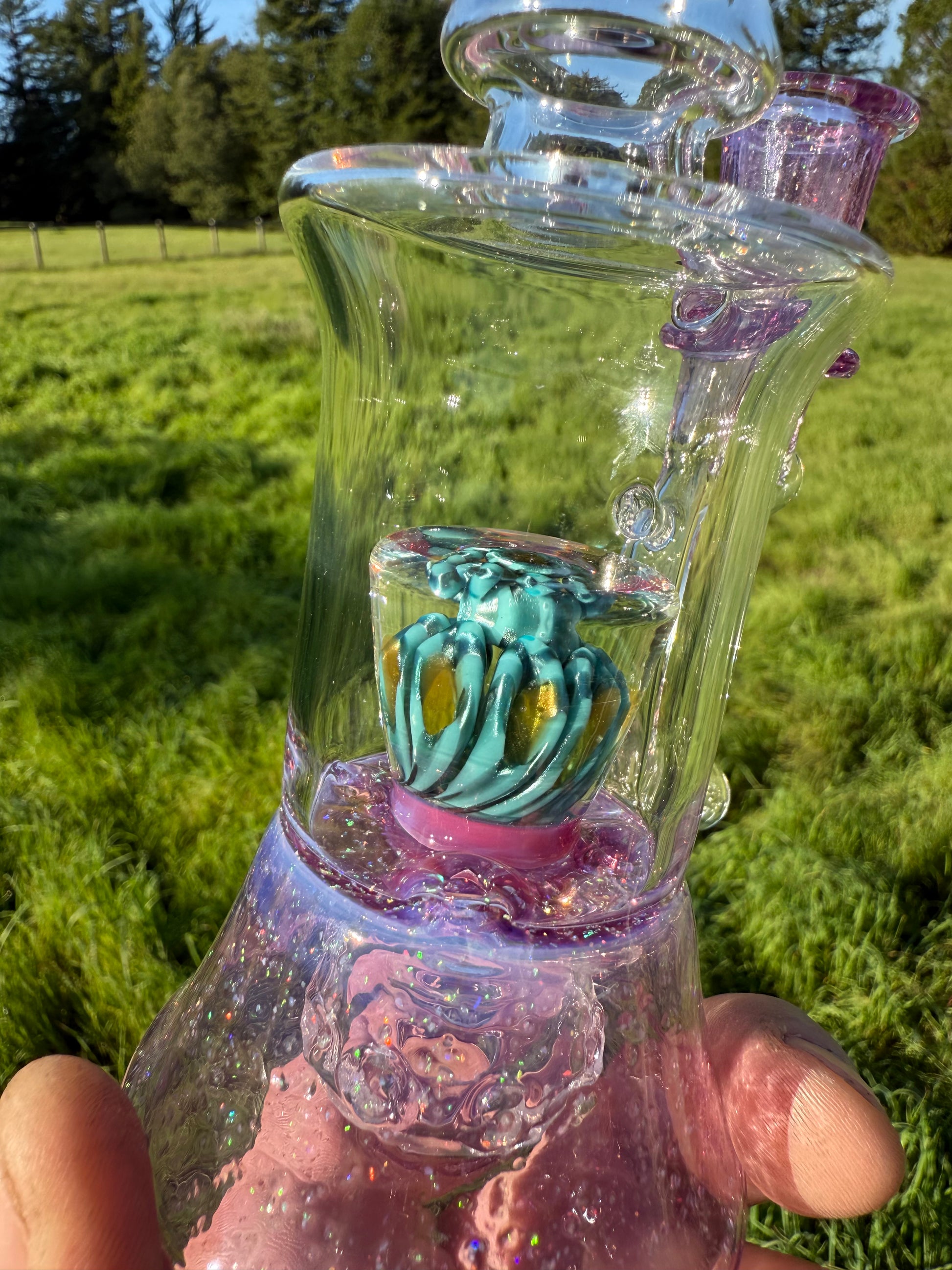 This is my style of the Blooper Rig. I make and epic reduction marble for the encapsulated center piece of each on of these to bring the piece to life. It comes with a 4 hole disc perk along with a 4 hole blooper perk